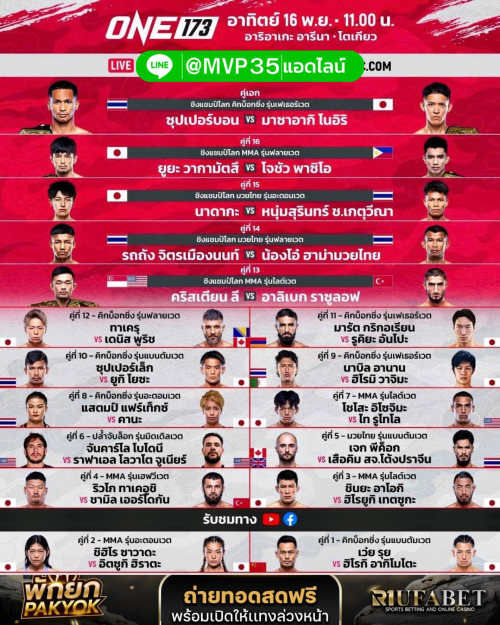 ✅⭐↪️สมัครสมาชิกใหม่@MVP35✅⭐↪️สอบถามเพิ่มเติม@MVP35✅⭐↪️ทางเข้าเว็บไซต์@MVP35อัปเดตไฟต์การ์ด #ONE173 ล่าสุด รับประกันความเดือด พร้อมดูสดฟรี กับ ทางบ้านเขียว @MVP35 #ดูมวยONE173ฟรี #ดูมวยONE173 #ดูมวยone173 #ดูมวยวัน173 #ONE173 อาทิตย์ 16 พ.ย. 68 อาริอาเกะ อารีนา | กรุงโตเกียว | ญี่ปุ่น